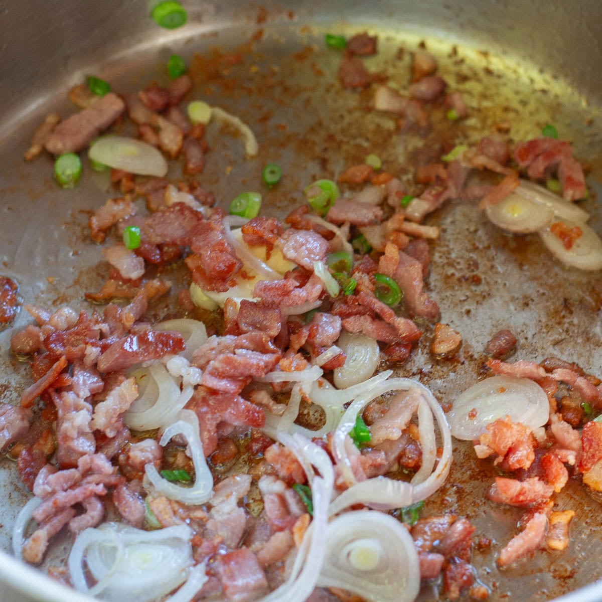 - In a large skillet saute the bacon until crisp, add the shallots and of the 1/2 green onions and garlic. Cook until shallots are softened.
