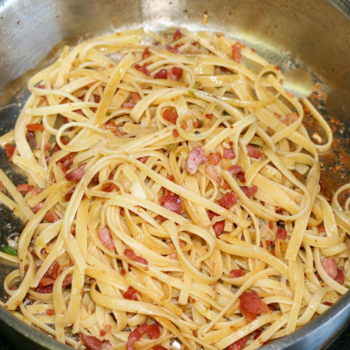 - When the pasta is finished cooking, drain well, then add it to the skillet of bacon mixture. Toss well to combine.