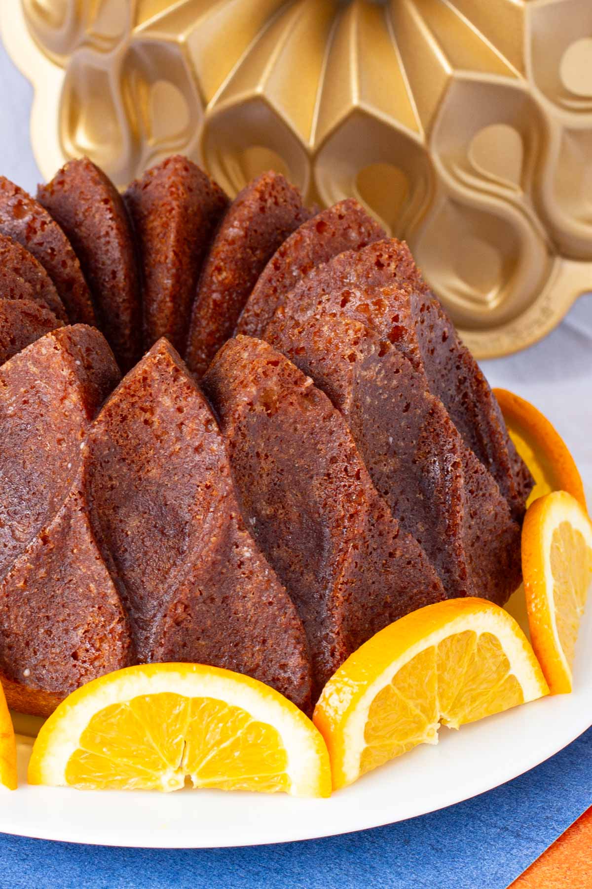 This cake is incredibly moist and delicious! To add an additional touch of citrus sweetness I topped the cake with an orange glaze. This cake baked up perfectly in my decorative bundt pan. I own a collection of decorative bundt cake pans like the one I use for my Chocolate Ganache Cake. These cake pans make any cake look like they were bought at a fancy bakery.