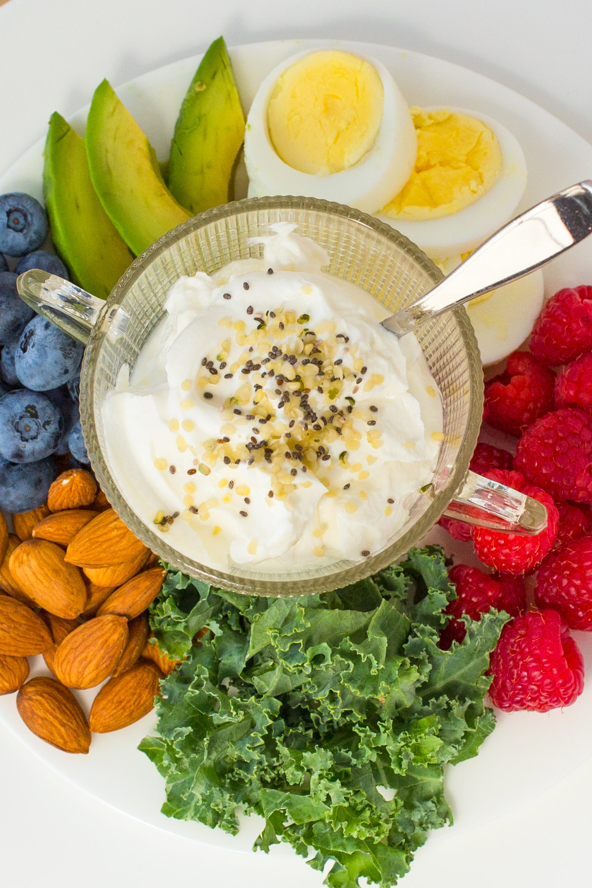 - Arrange berries, almonds, kale, avocado, hard boiled egg on a plate with the cup of yogurt. Enjoy!