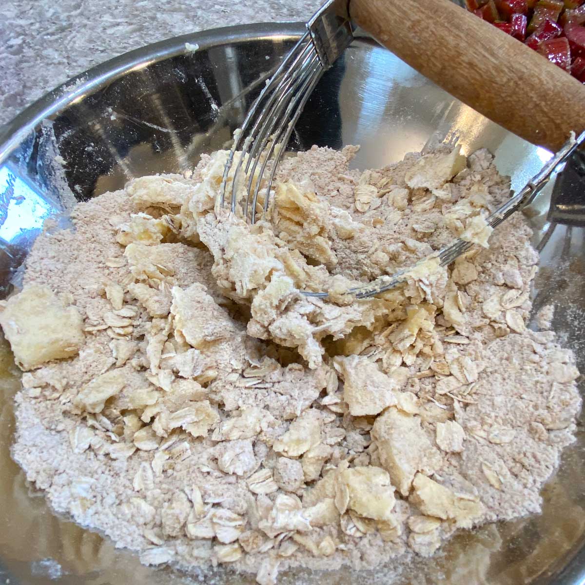 - Sprinkle the crumb mixture evenly over the rhubarb.